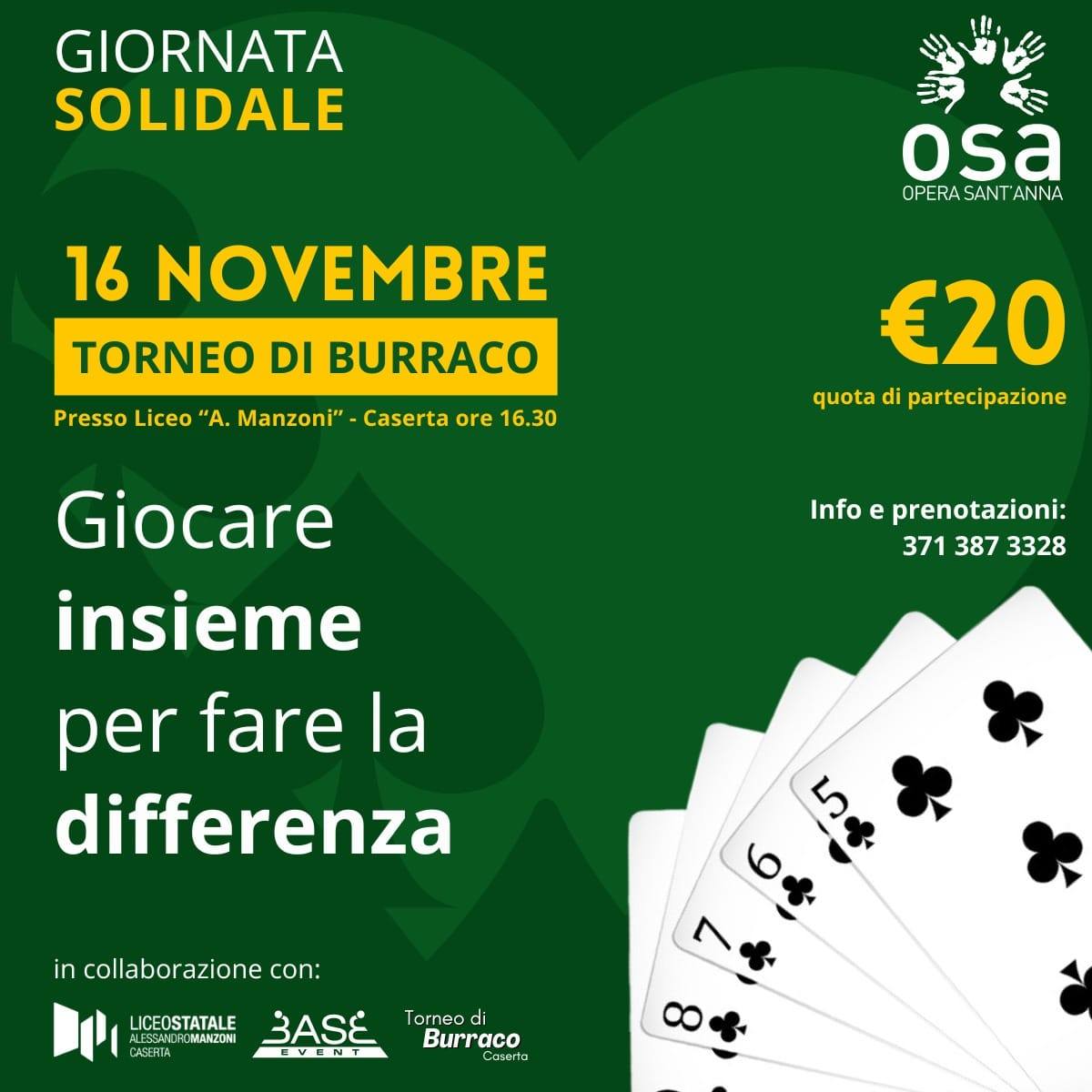 L’evento, organizzato con il prezioso supporto della società Base Event, prevede un Torneo di Burraco Solidale con quota di partecipazione di € 20, il cui ricavato sarà interamente destinato alla Mensa Solidale OSA, punto di riferimento per tante famiglie casertane che ogni settimana trovano un pasto caldo e un sorriso accogliente.
