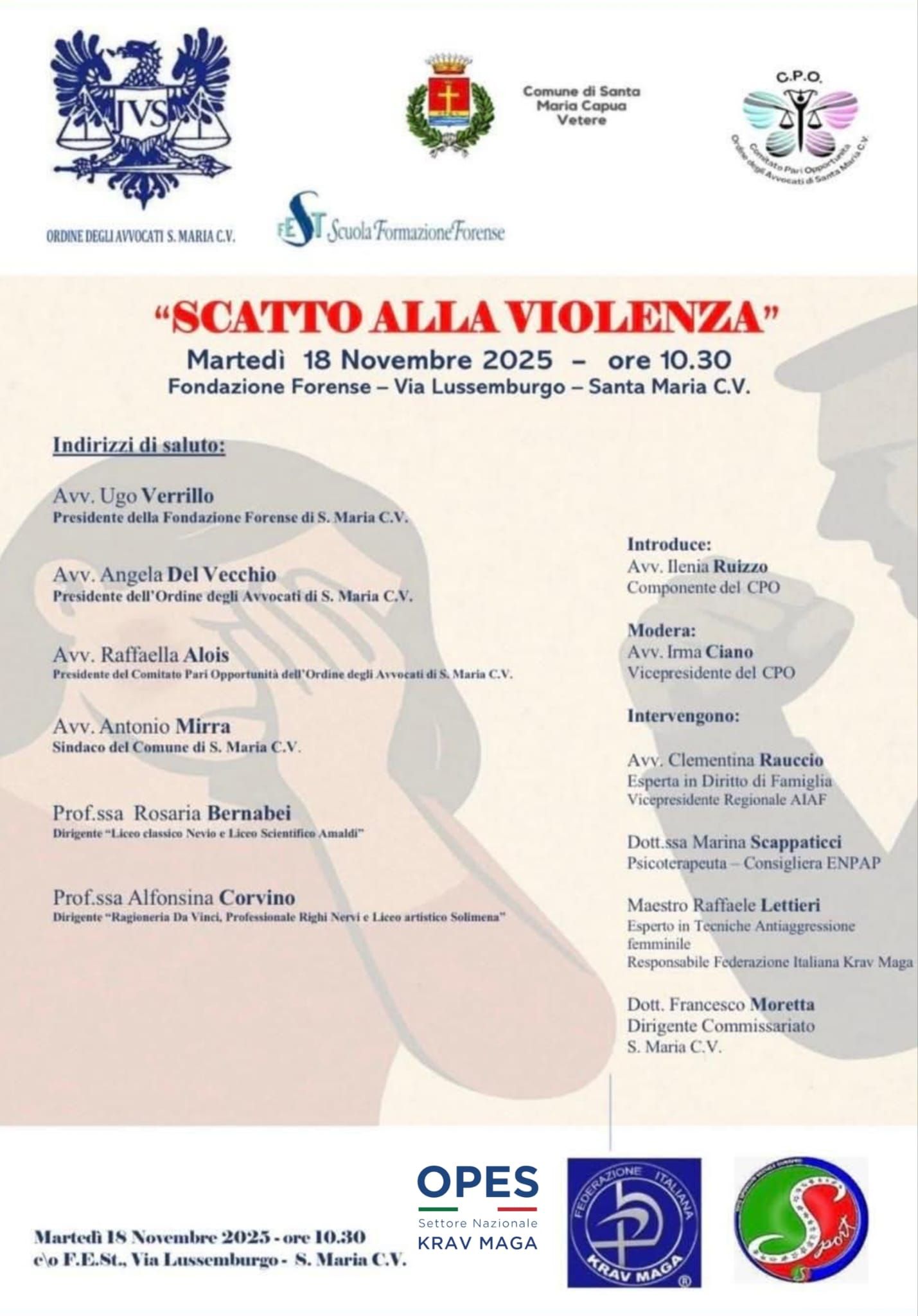 L’Ordine degli Avvocati di Santa Maria C.V., la Fondazione Forense, il Comitato Pari Opportunità e il Comune di Santa Maria C.V., con la collaborazione del Settore Nazionale Krav Maga OPES e della Federazione Italiana Krav Maga, organizzano l’evento “SCATTO ALLA VIOLENZA”.
